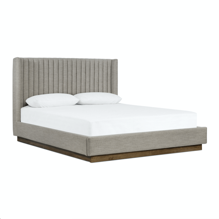 The Raffo Bed features a tall, vertical-channeled headboard that is upholstered in a light grey high-performance fabric for a sensible take on modern bedroom styling. The natural brown parawood base grounds the high-style modern look.